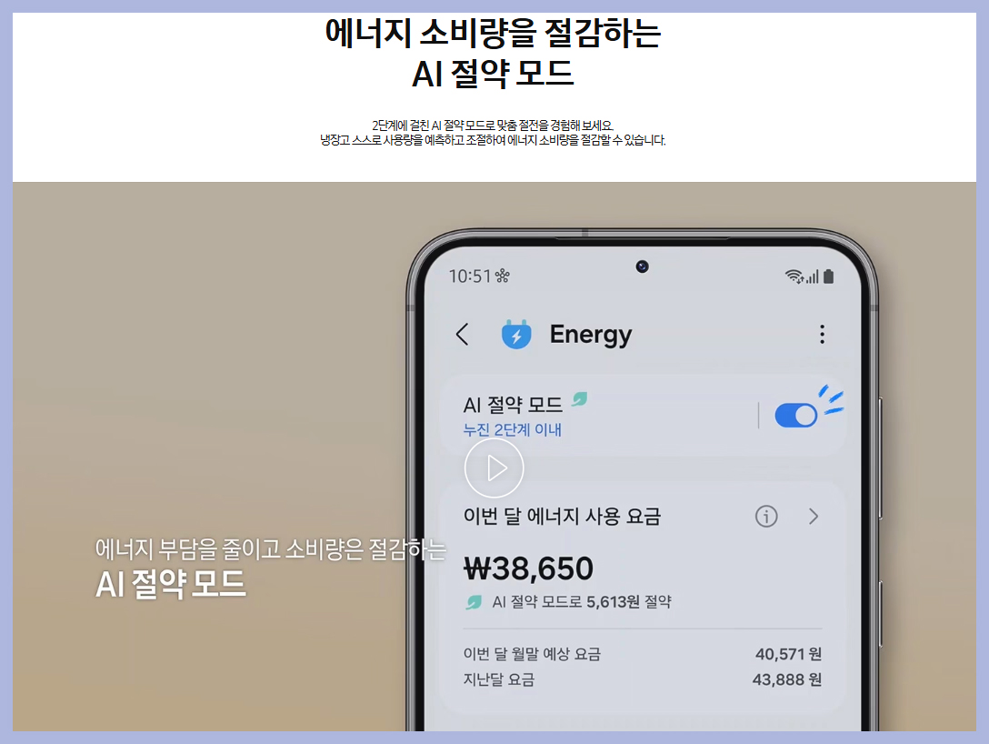 스마트 폰을 통해 설정할 수 있으며 AI 절약모드를 설정하면 에너지 사용량은