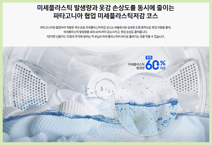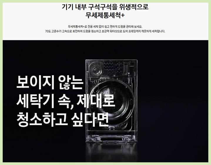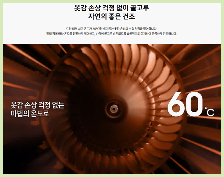 세탁건조기 는 드럼 내부 최고 온도가 60도를 넘지 않아 옷감 손상과 수축