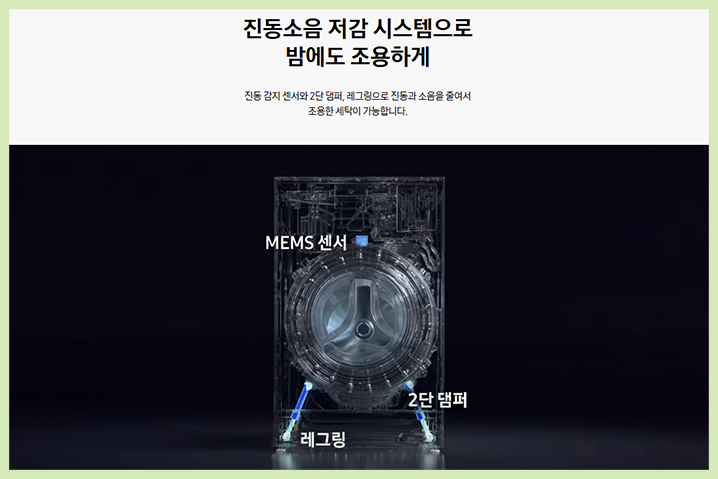 센서와 2단댐퍼 레그링으로 진동과 소음을 줄여서 조용하게 세탁이 가능해진