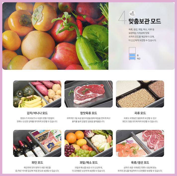 보관하는 재료에 맞게 핵심 기능만 모아 상중하 12개 맞춤 보관모드를 탑재해