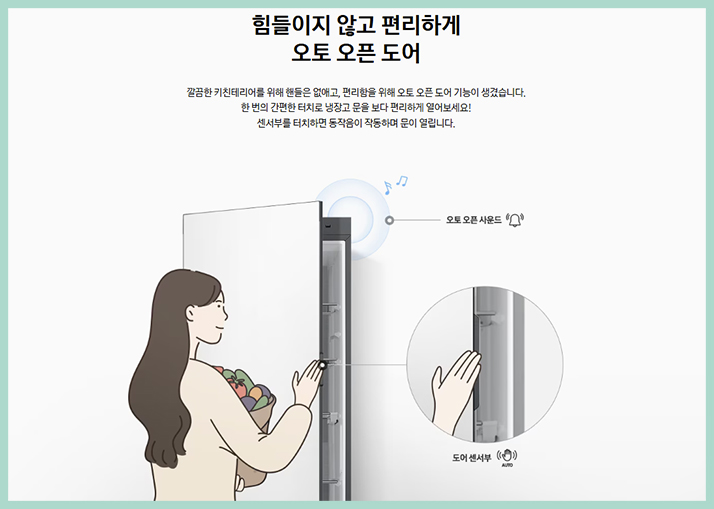 도어 손잡이를 없애도 센서를 탑재하여 터치만으로 냉동고 도어를 열 수 있어요 또한