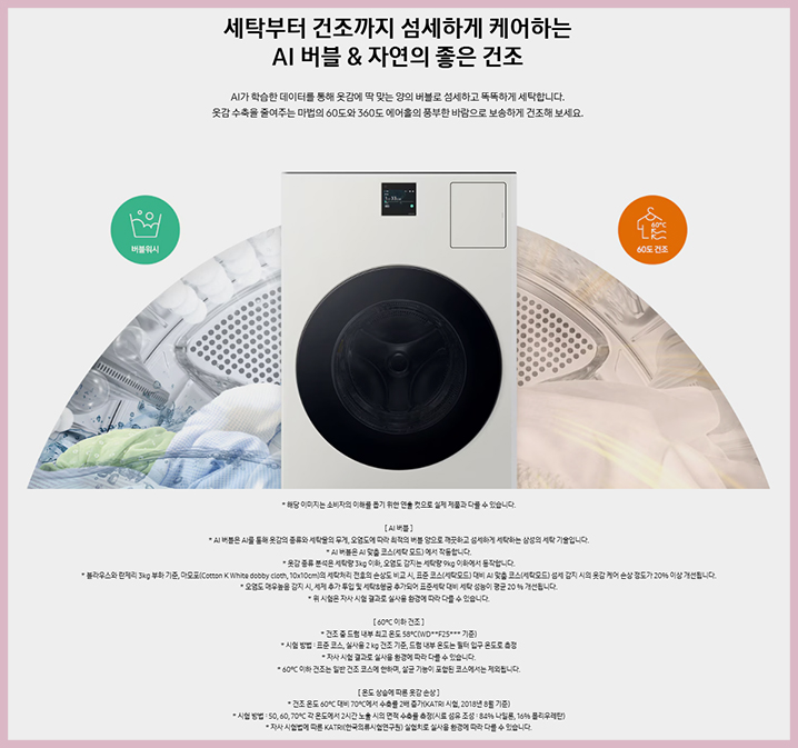 의류 손상은 줄이고 세탁부터 건조까지 섬세하게 케어할 수 있도록 AI 버블과