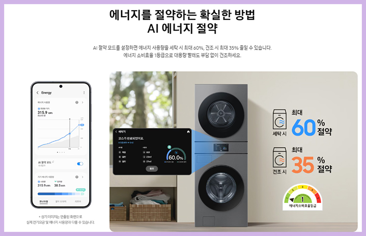 싱스 앱에서 AI 절약모드를 설정하시면 세탁 시 60% 건조 시 35% 의 에너지