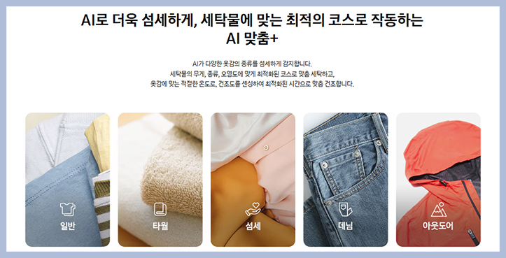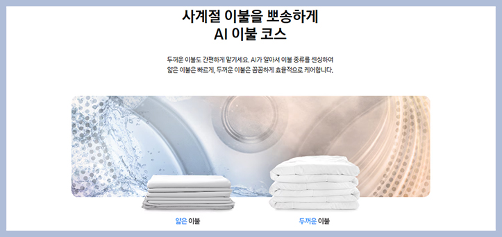 수축 걱정을 덜어주고 빨래양에 따라 AI가 온도를 정밀하게 제어하고 바람이