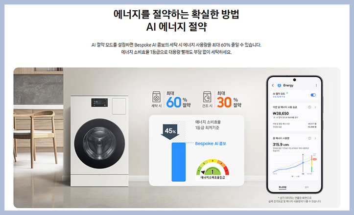 AI 절약모드를 설정하여 세탁 시 에너지 사용량을 최대 60% 줄일 수 있으며 에너지