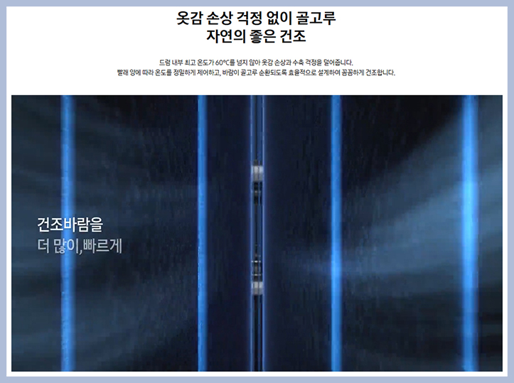 드럼 내부 최고 온도가 60도를 넘지 않는 저온 건조 방식을 적용하여 옷감 손상과
