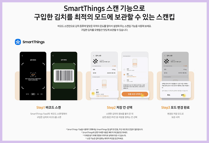 스마트 싱스 앱을 통해 보관할 식재료를 검색하면 최적의 보관모드를 추천해 주는