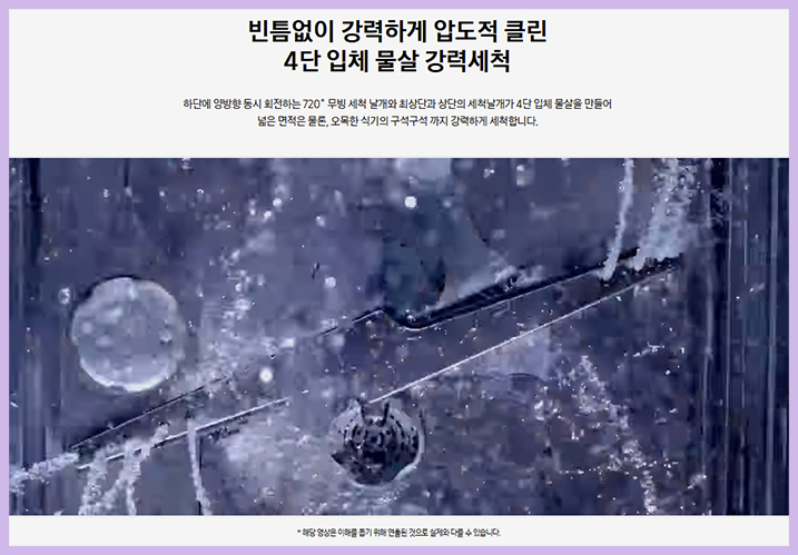 가 4단 입체물살을 만들어 세척기 내부에 골고루 분사해 주고 오목한 식기류까지