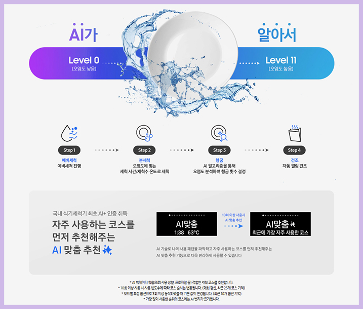 복잡한 과정 없이 한 번의 터치만으로 세척기를 작동시킬 수 있는 AI 맞춤 세척+ 코스