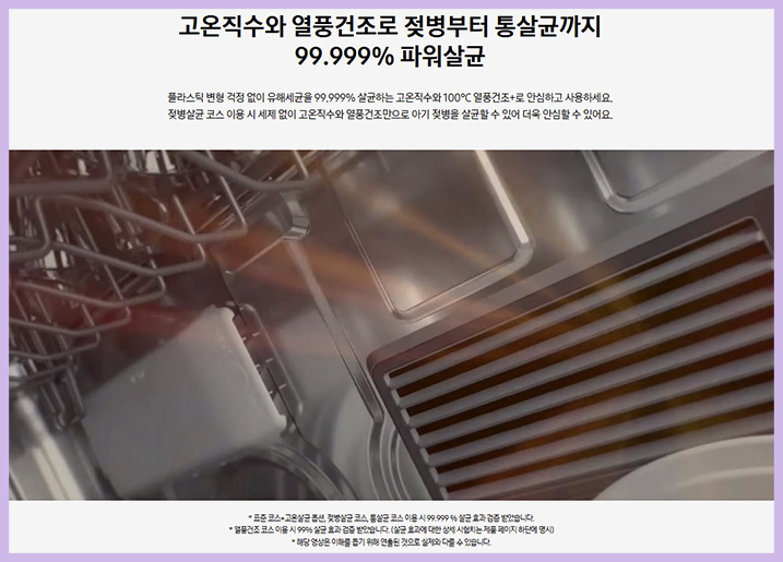 유해 세균을 99.999% 살균하는 고온 직수와 100도의 열풍건조+ 기능을 통해 살균