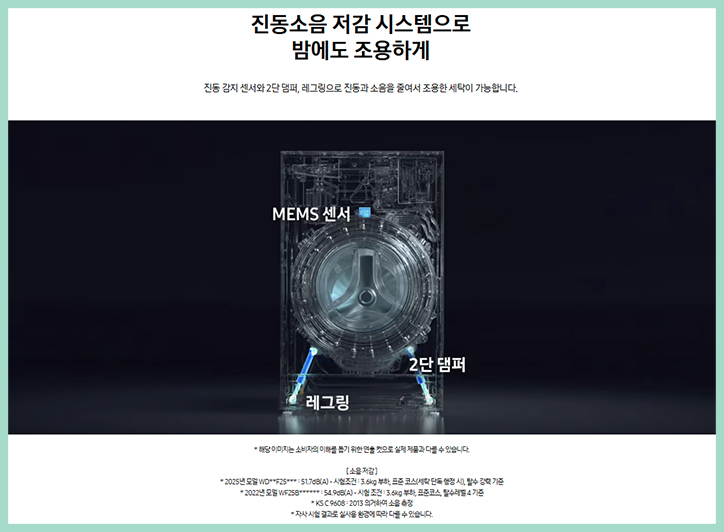소음 저감 시스템을 탑재한 WD80F25CHW WD80F25CHY 는 진동감지 센서