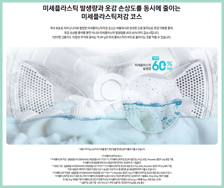 드럼동작으로 옷감 마찰을 줄여 옷감 손상을 줄여 줄 뿐만 아니라 미세 플라스틱
