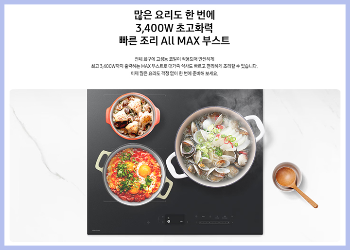 빠르게 요리를 해야 하는 경우 부스터 기능을 탑재하여 2.2kw~3.4kw의